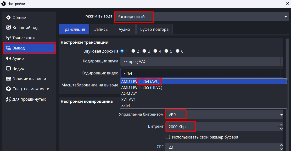 В разделе Вывод рекомендуем установить следующие максимальные параметры: