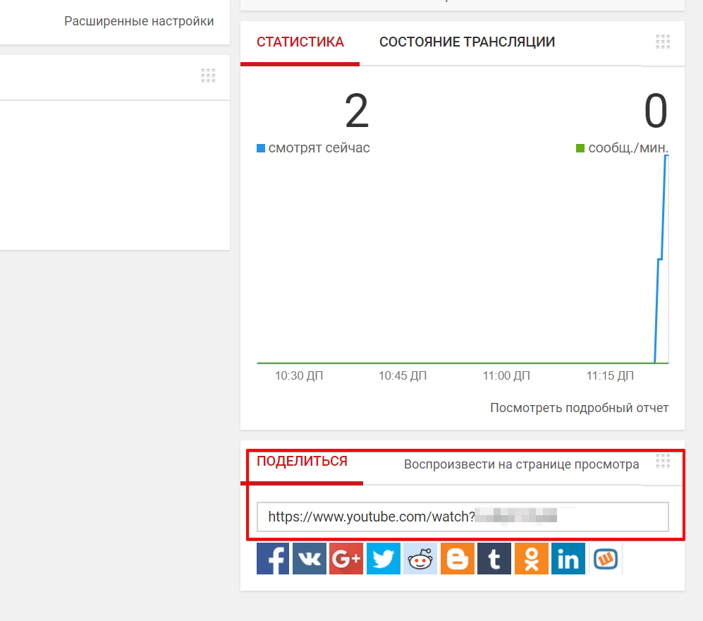 На YouTube вы попадете на вкладку Прямые трансляции. В нижнем правом углу страницы скопируйте ссылку на трансляцию.