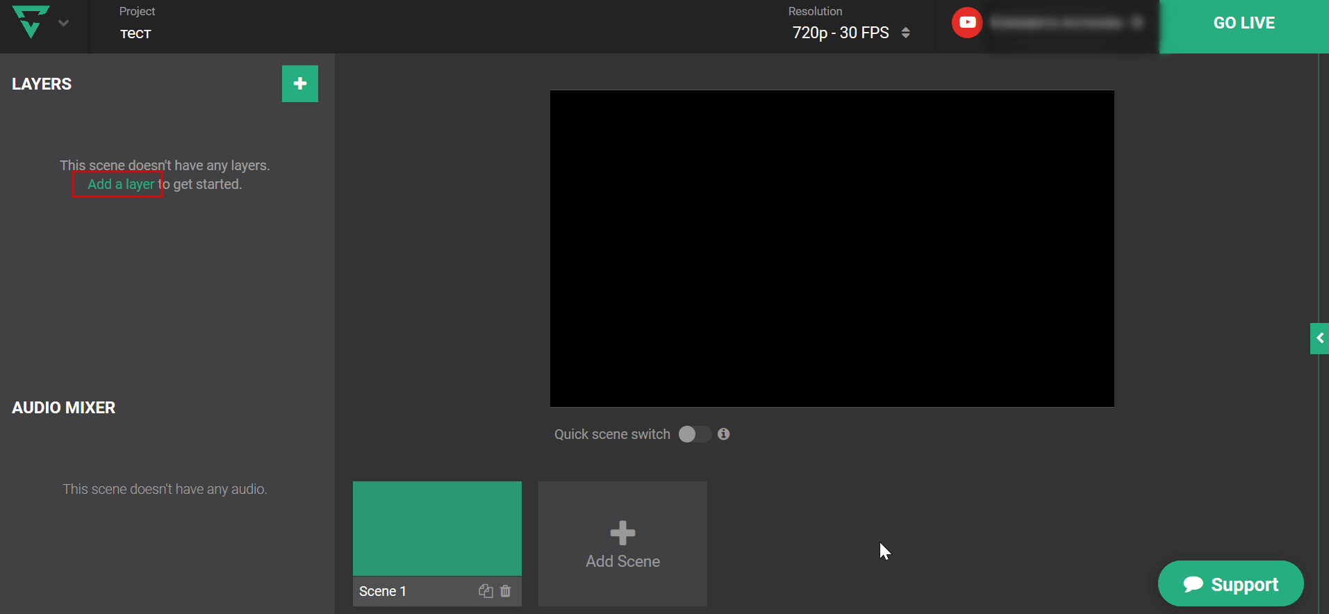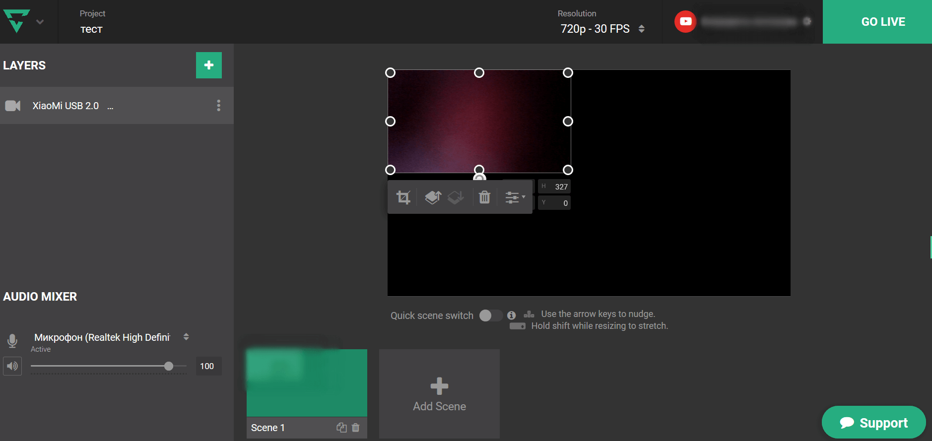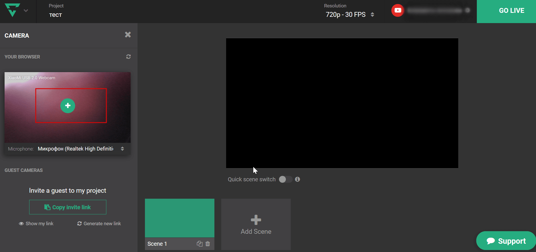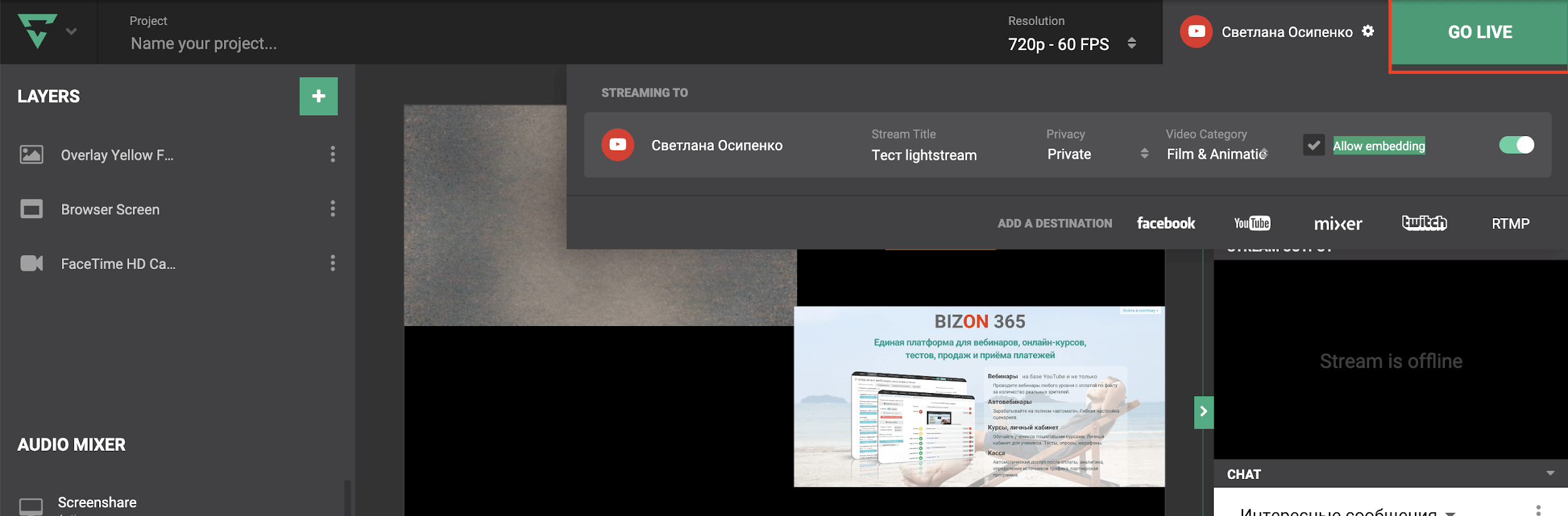 Когда все настройки выставлены запустите эфир, нажмите кнопку GO LIVE.