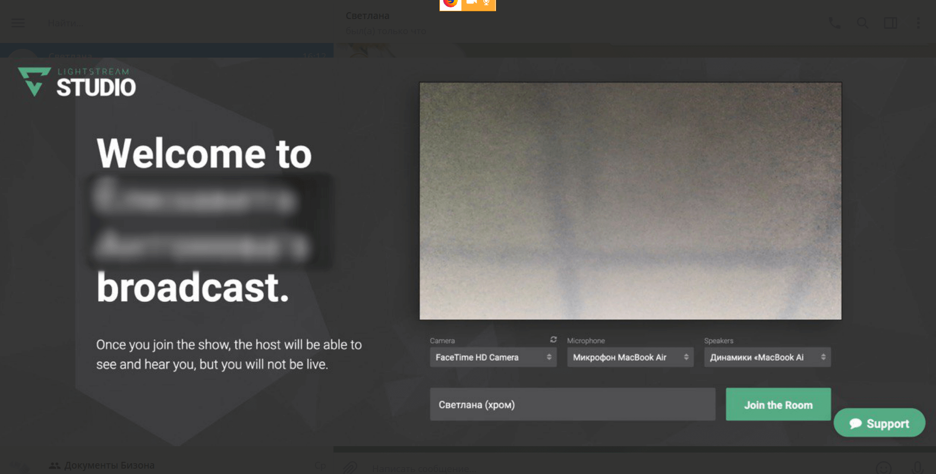 При переходе по ссылке откроется вход в комнату. Спикеру нужно ввести имя, выбрать камеру и микрофон.