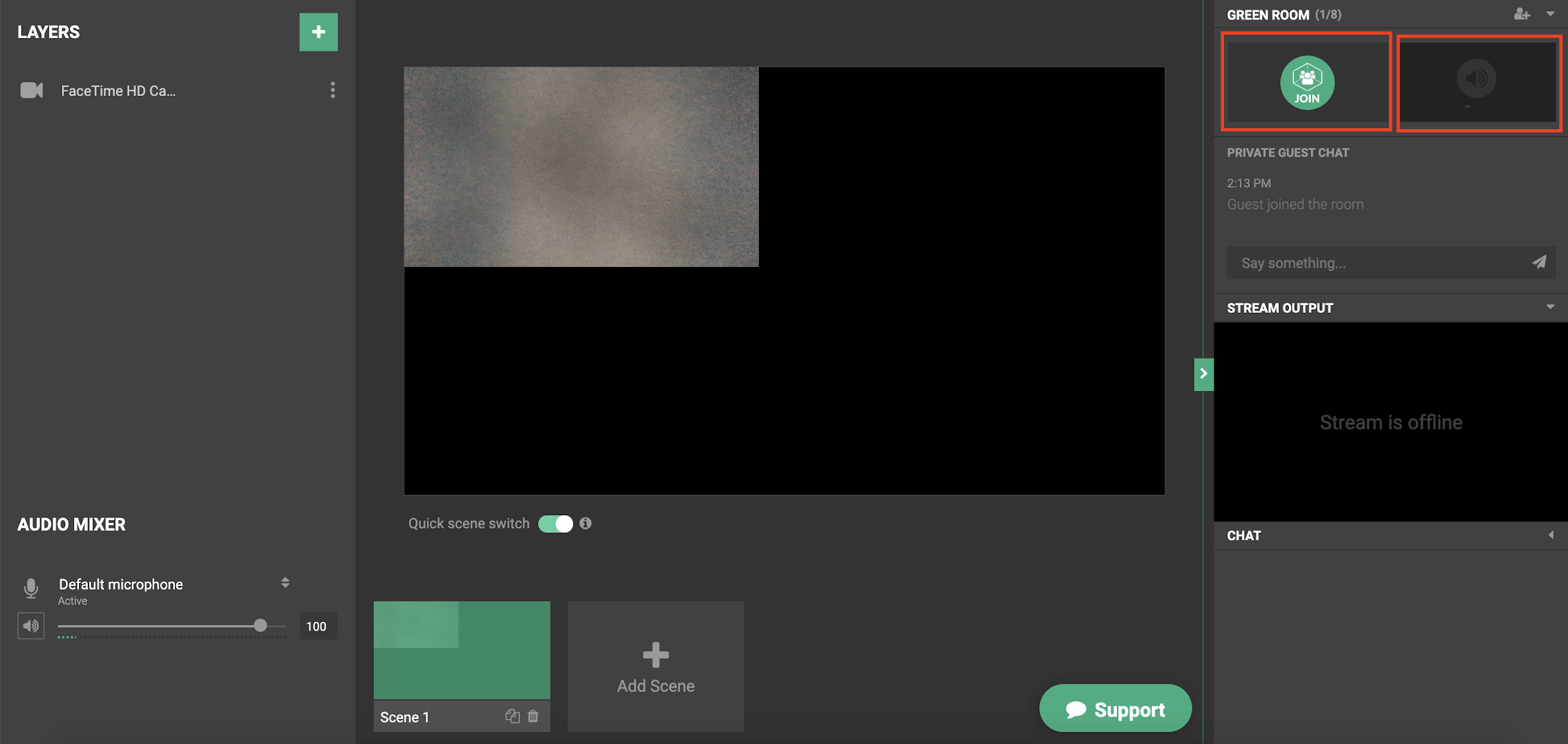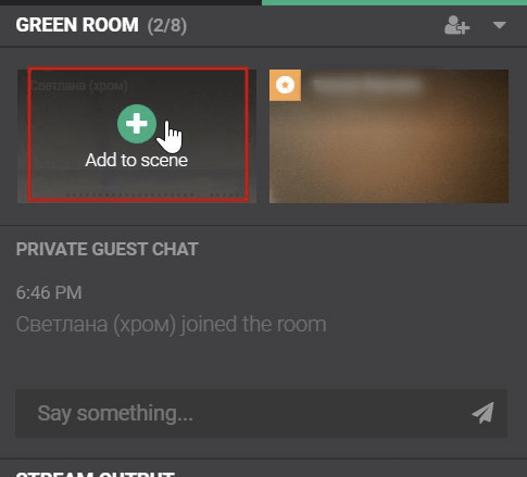 После того как спикер присоединится, он появится в окне справа. Нужно нажать кнопку Join чтобы добавить его в трансляцию.