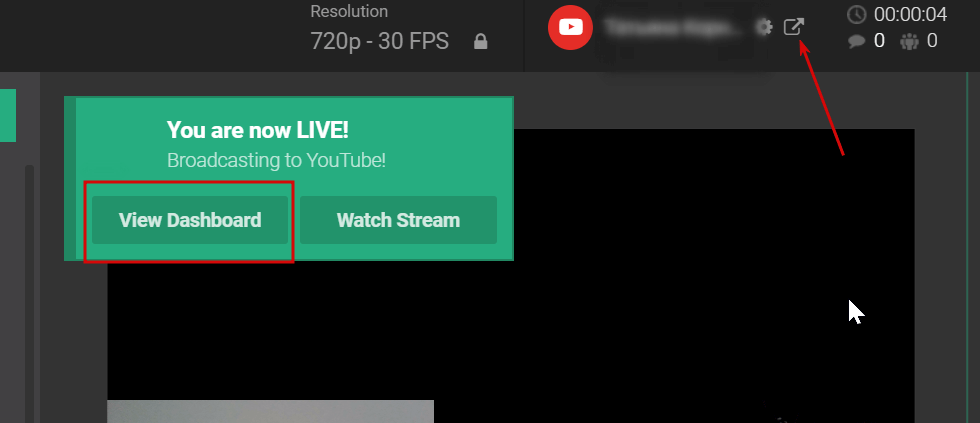 Если запуск прошел успешно, появится сообщение. Нажмите кнопку View Dashboard, чтобы перейти в панель управления на YouTube и скопировать ссылку на трансляцию. Либо нажмите эту ссылку