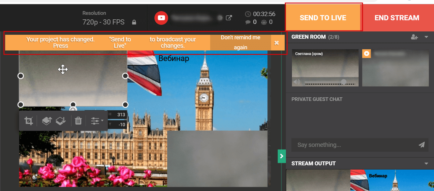 Важно! Если в процессе трансляции что-то изменится на главном экране (например добавили изображения или спикера в процессе трансляции), нужно нажать кнопку Send To Live, чтобы отправить изменения в эфир.