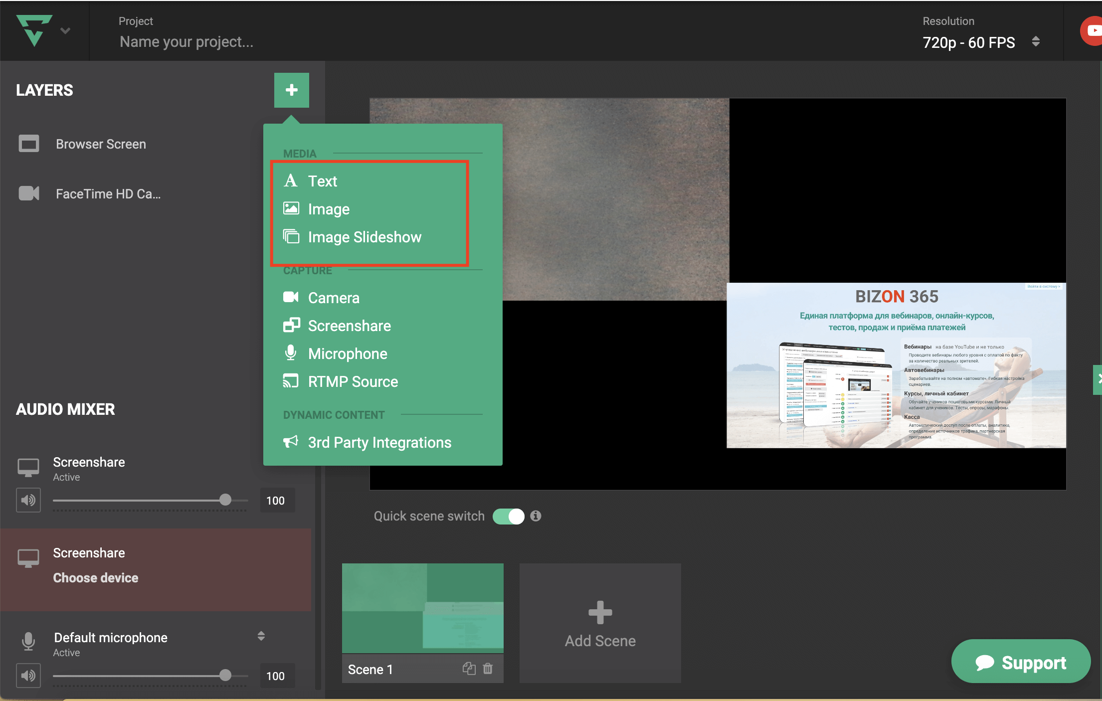 Также в трансляцию можно добавить надпись, изображение или слайдшоу (перелистывается автоматически с заданным интервалом)