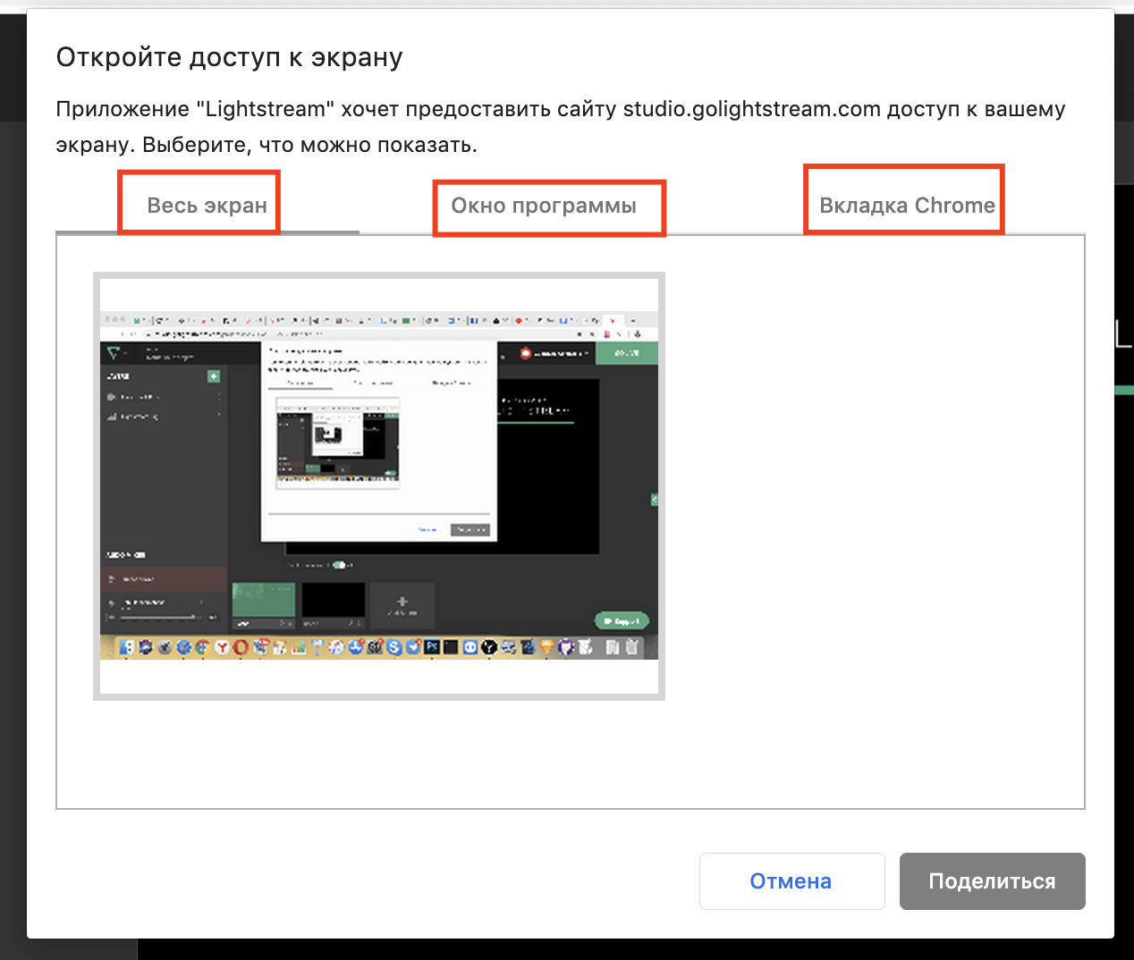 Показать можно весь экран, окно программы, либо вкладку браузера.