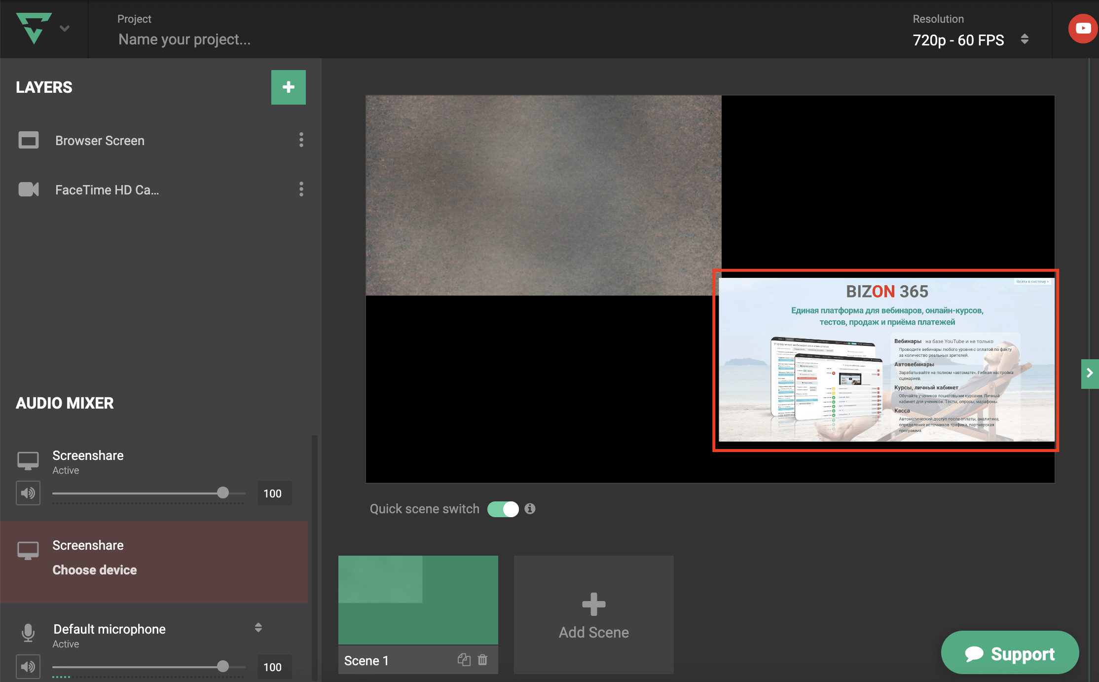 При необходимости добавляем сцену с демонстрацией экрана. Для того, чтобы использовать эту функцию нужно установить специальное расширение для браузера Chrome. Уведомление об этом вы увидите при первом включении демонстрации.