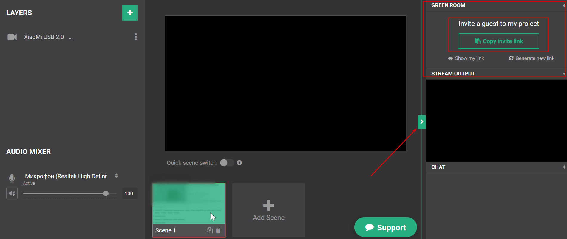 Откройте панель справа чтобы скопировать ссылку для приглашения спикеров.