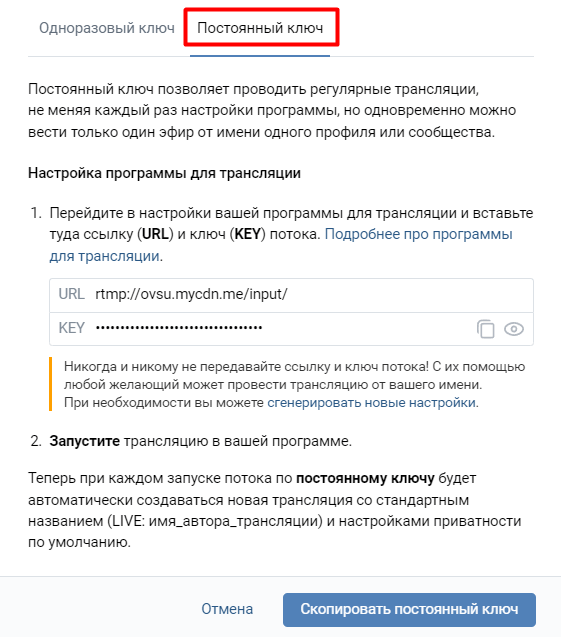 Далее переходите на вкладку Постоянный ключ и скопируйте ссылку (URL) и ключ (KEY) потока.