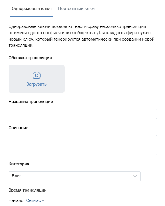 В открывшемся окне создания трансляции на вкладке Одноразовый ключ заполните Название трансляции (его видит зритель в трансляции) и выберите Категорию. Можно добавить обложку трансляции, описание и запланировать время трансляции.