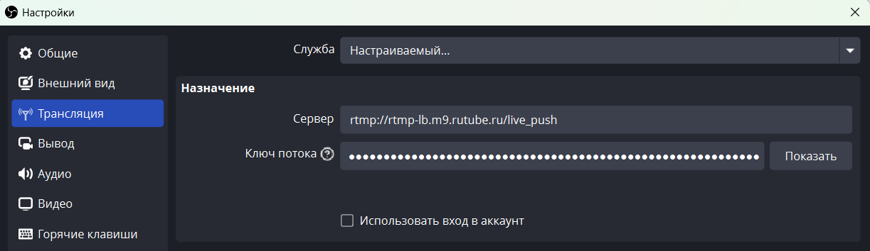 2. Скопируйте полученные данные в видеокодер (OBS Studio)