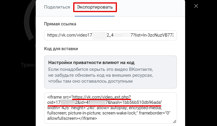 Копировать нужно ссылку, которая находится в кавычках между src= и widht. В нашем примере ссылка - https://vk.com/video_ext.php?oid=17****2&id=4****78&hash=1bb56b510db96ada