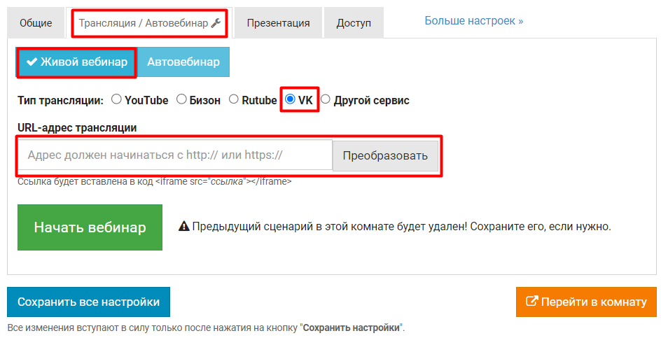 - В настройках вебинарной комнаты в Бизоне нажмите кнопку Начать вебинар и Перейти в комнату. Если вебинар в комнате будет запущен раньше, чем трансляция начнется в ВКонтакте, то зрителю необходимо будет обновить страницу.