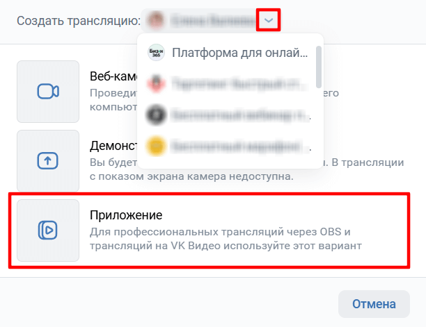 Проверьте от чьего имени будете выходить в эфир - от имени сообщества или личного профиля. Выберите нужный вариант в поле Создать трансляцию.