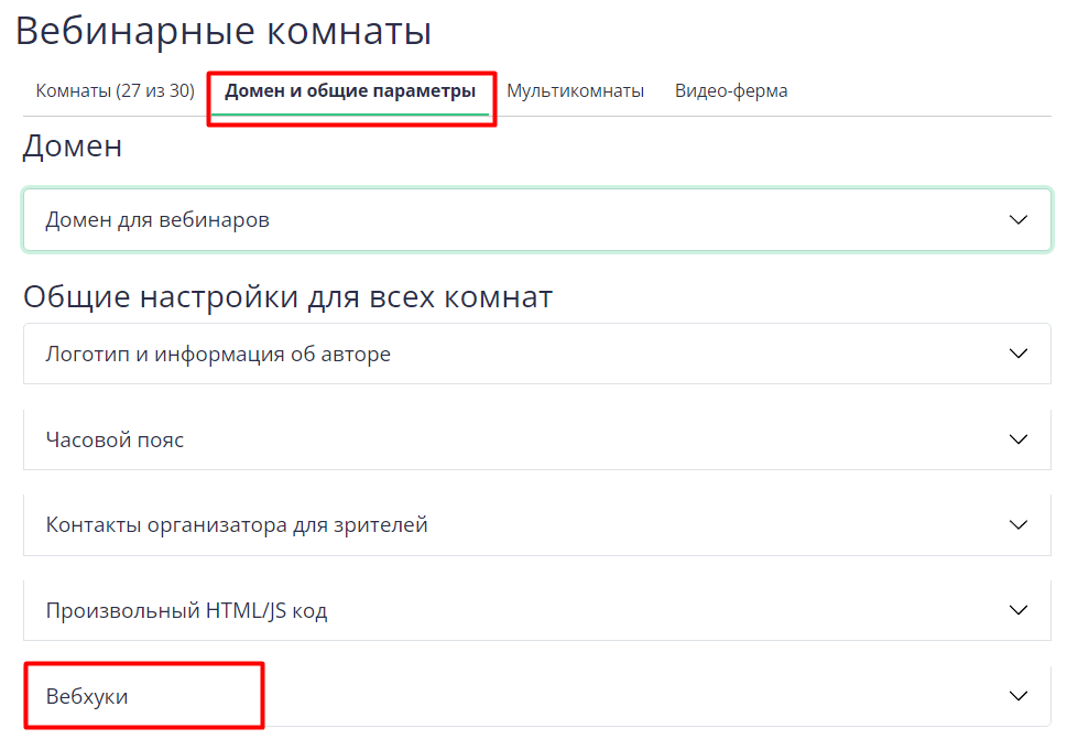1. На странице Вебинарные комнаты перейдите во вкладку Домен и общие параметры.