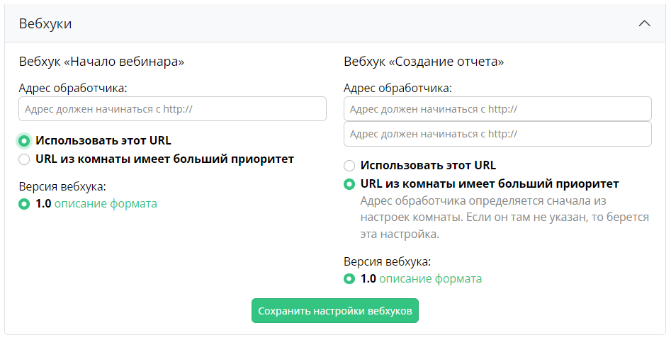 Пропишите ссылки в соответствующих полях. По указанному здесь адресу вебхук отправится в первую очередь, если настройки делались также и в Общих параметрах и был выбран пункт URL из комнаты имеет больший приоритет.