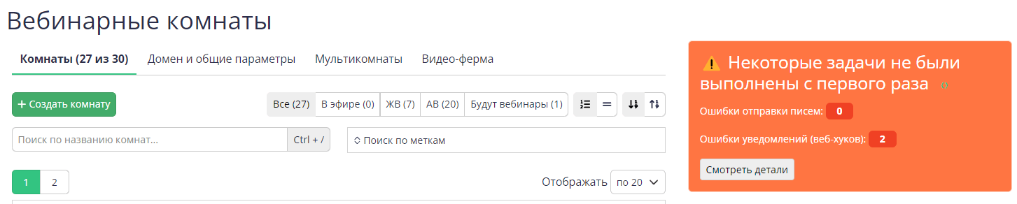 Если при отправке вебхука произойдет ошибка, на странице вебинарных комнат появится уведомление.