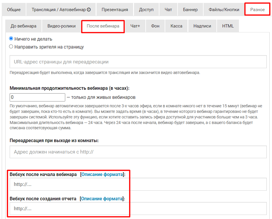 2. Чтобы добавить адрес обработчика вебхука в конкретной комнате, откройте её настройки. Перейдите на вкладку РазноеПосле вебинара.