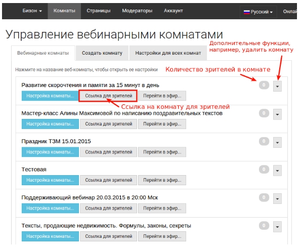 Для своих задач Вы можете создавать множество комнат. Каждая комната - вебинар на свою тему.