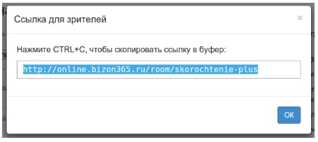 Чтобы узнать ссылку для слушателей, нажмите на кнопку Ссылка для зрителей под названием комнаты. Откроется окно: