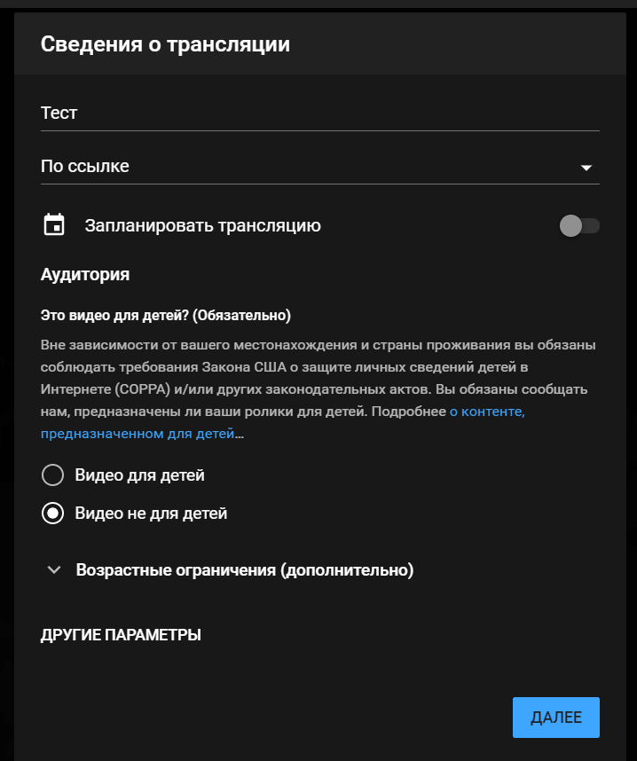 Чтобы убедиться, что функция встраивания прямых трансляций включена на канале, создайте трансляцию. Нажмите синюю кнопку ДАЛЕЕ.