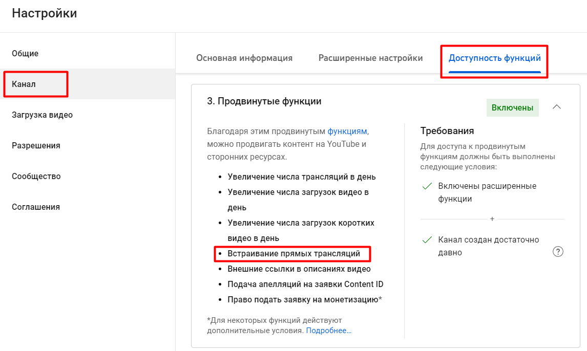 На каналах созданных давно, продвинутые функции становятся доступны автоматически. Как показывает практика, встраивание прямых трансляций доступно после включения расширенных функций.
