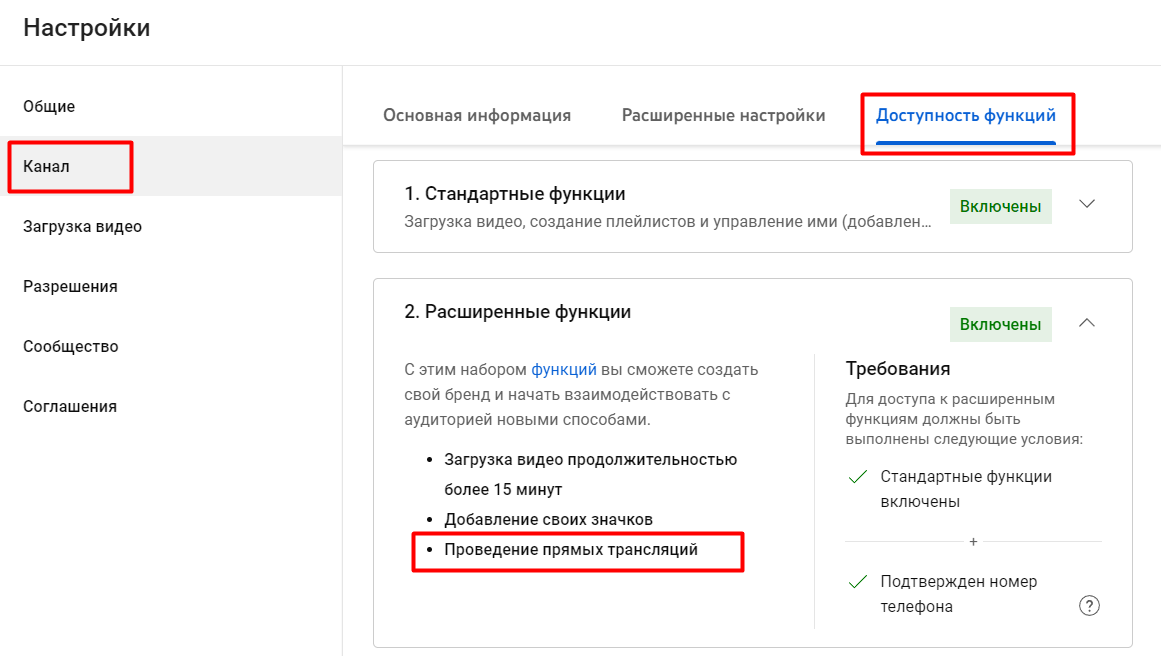 Проверить оба пункта можно, зайдя в настройки Творческой студии → раздел Канал → вкладка Доступность функций.